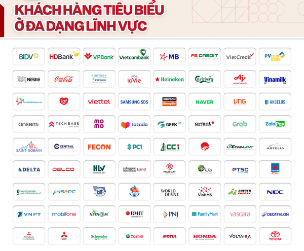 - Ngân hàng, Tài chính & Bảo hiểm: BIDV, HD Bank, VP Bank, Vietcombank, MB Bank, FE Credit, VietCredit, MB Ageas Life, PVComBank, Momo, PTI,…
