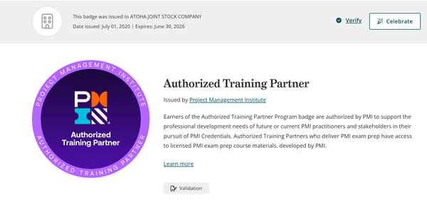 Từ ngày 01/07/2020, Atoha chính thức được công nhận là PMI ATP Premier (PMI Authorized Training Partner - Premier level) - Đối tác đào tạo uỷ quyền cao cấp của PMI, sau khi đáp ứng và vượt qua những tiêu chuẩn khắt khe về chất lượng và hiệu quả đào tạo.
