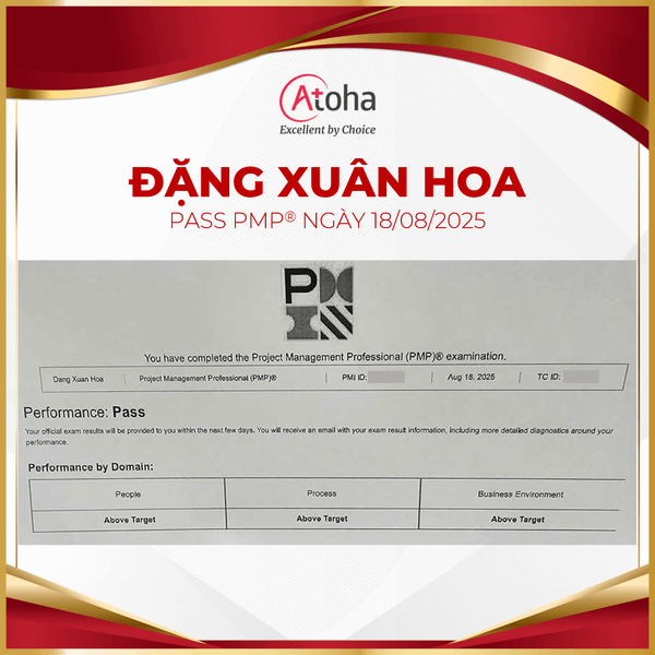 Khóa luyện thi PMP® của Atoha dành riêng cho Samsung SDS vừa tiếp tục ghi nhận thêm một thành tích xuất sắc - chị Đặng Xuân Hoa đã pass PMP® ngay trong lần thi đầu tiên vào ngày 18/08/2025. Atoha tin rằng đây là thành quả hoàn toàn xứng đáng dành cho những cố gắng và nỗ lực không ngừng nghỉ của chị trong suốt hành trình vừa qua.