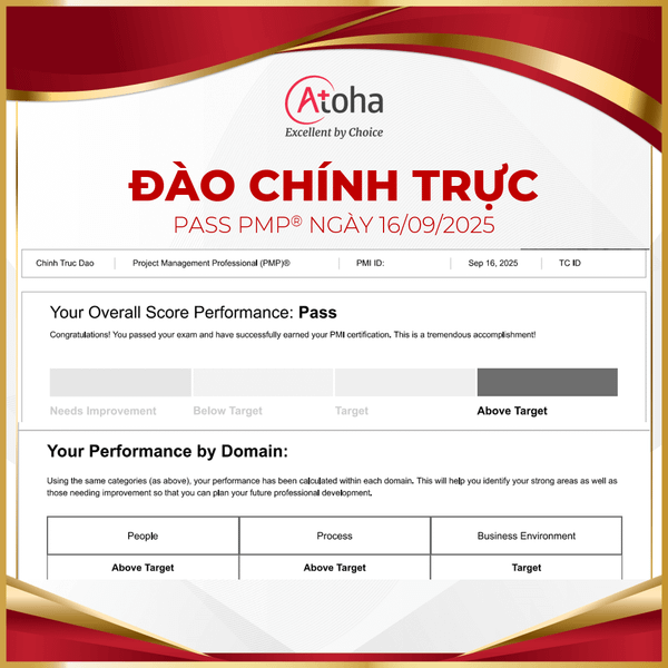 Hành trình chinh phục chứng chỉ PMP® của anh Đào Chính Trực đã khép lại trọn vẹn khi anh thành công pass PMP® on the first try. Atoha tin rằng, chứng chỉ PMP® sẽ là bệ phóng vững chắc, giúp anh tiến xa hơn nữa trên chặng đường sự nghiệp phía trước.