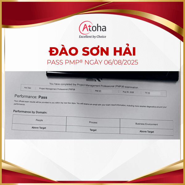 Giờ đây, với nền tảng kiến thức vững chắc cùng "bệ phóng PMP®", Atoha tin rằng anh Hải sẽ tự tin dẫn dắt những dự án phức tạp, biến thách thức thành cơ hội bứt phá và tạo ra những giá trị đột phá cho tổ chức. Một lần nữa, chúc mừng anh Hải! Atoha chúc anh sẽ tiếp tục vững vàng trên con đường sự nghiệp, gặt hái nhiều thành công rực rỡ và không ngừng khẳng định vị thế của mình trong lĩnh vực quản lý dự án.
