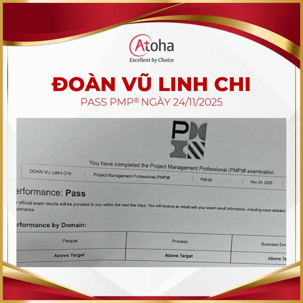 Atoha trân trọng gửi lời chúc mừng đến chị Đoàn Vũ Linh Chi, học viên khóa PMPONLINEPRO43, đã chính thức vượt qua kỳ thi PMP® với kết quả tối đa (đạt Above Target ở cả 03 domains) vào ngày 24/11/2025. Đây là dấu mốc quan trọng tiếp nối hành trình phát triển chuyên môn bền bỉ của chị trong lĩnh vực quản lý dự án.