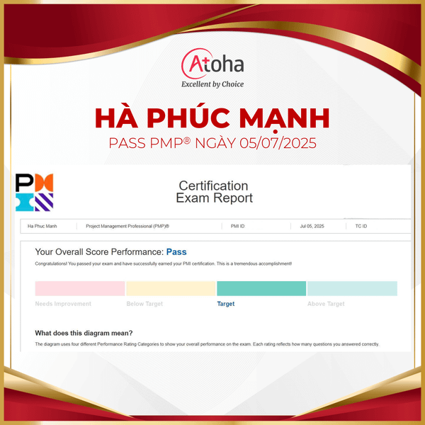 Bảng vàng học viên Atoha tháng 07 vừa ghi nhận thành tích ấn tượng của anh Hà Phúc Mạnh khi anh chính thức vượt qua kỳ thi chứng chỉ PMP® chỉ trong lần thi đầu tiên. Chúc mừng anh Mạnh và cảm ơn anh đã tin tưởng lựa chọn Atoha đồng hành trên hành trình PMP® vừa qua.
