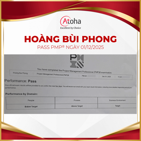 Khởi đầu tháng 12 đầy rực rỡ với thành tích ấn tượng của anh Hoàng Bùi Phong, khi anh xuất sắc vượt qua kỳ thi PMP® ngay trong lần thi đầu tiên vào ngày 01/12/2025. Atoha tin rằng chứng chỉ PMP® sẽ trở thành bệ phóng vững chắc, mở ra cho anh thêm nhiều cơ hội và dấu ấn thành công trong năm 2026, cũng như hành trình phát triển sự nghiệp phía trước.