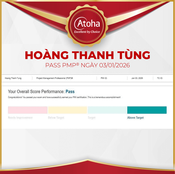 Thành quả này là kết tinh của sự kiên trì học tập, tinh thần kỷ luật và quyết tâm theo đuổi mục tiêu đến cùng, ngay cả khi quỹ thời gian bị chia sẻ cho nhiều ưu tiên khác. Atoha tin rằng, với PMP® trong tay, anh Tùng sẽ có thêm nhiều cơ hội để mở rộng vai trò, nâng tầm ảnh hưởng và tạo ra những dự án có giá trị bền vững hơn trong thời gian tới.