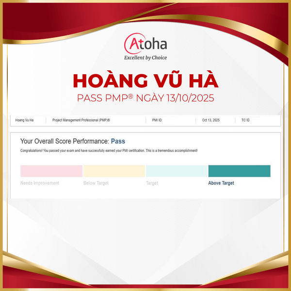 Atoha trân trọng hành trình của chị – một hành trình giàu quyết tâm và tinh thần cầu tiến. Với nền tảng kiến thức vững vàng và tư duy quản lý chuẩn quốc tế từ PMP®, chị chắc chắn sẽ tiếp tục tiến xa hơn trong sự nghiệp, và trở thành nguồn cảm hứng tích cực cho cộng đồng học viên Atoha cũng đang miệt mài trên con đường nâng tầm chuyên môn.