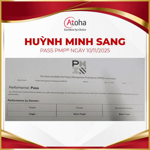 Một cột mốc đáng nhớ nữa vừa được ghi dấu trong cộng đồng học viên Atoha - anh Huỳnh Minh Sang đã chính thức pass PMP® on the first try vào ngày 10/11/2025, kết thúc hành trình luyện thi đầy thử thách bằng một kết quả trọn vẹn và xứng đáng.