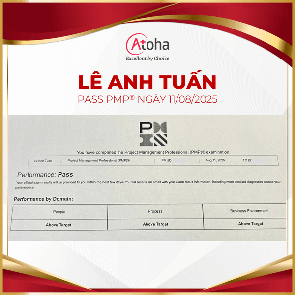 Hành trình chinh phục PMP® của anh là minh chứng rõ ràng cho thấy mọi giới hạn đều có thể được phá vỡ bằng sự quyết tâm. Được đồng hành cùng anh trong suốt thời gian qua là niềm vinh dự và tự hào của Atoha. Atoha tin rằng, với chứng chỉ PMP®, anh Tuấn đã có đủ hành trang để bứt phá, vươn xa hơn nữa trên con đường sự nghiệp.