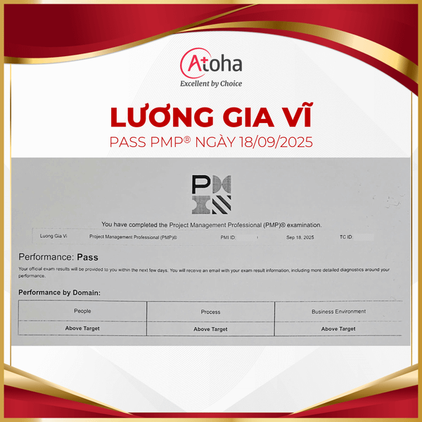 Thêm một thành tích xuất sắc của học viên Atoha trong tháng 09 này - anh Lương Gia Vĩ đã chính thức pass PMP® max score on the first try vào ngày 18/09/2025. Atoha vô cùng tự hào khi có cơ hội đồng hành cùng anh chinh phục chứng chỉ PMP® và xây dựng bệ phóng vững chắc cho hành trình phát triển sự nghiệp của mình.