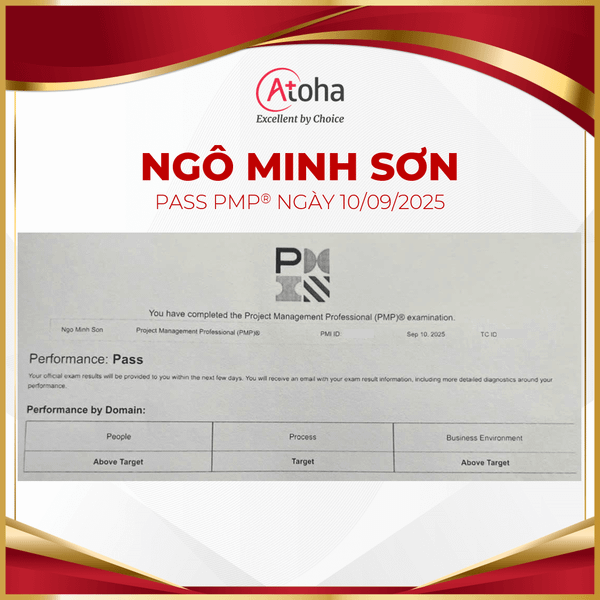 Atoha gửi lời chúc mừng nồng nhiệt nhất đến anh Ngô Minh Sơn, học viên lớp PMPPRO52, vì đã xuất sắc vượt qua kỳ thi PMP® ngay trong lần thi đầu tiên vào ngày 10/09/2025.