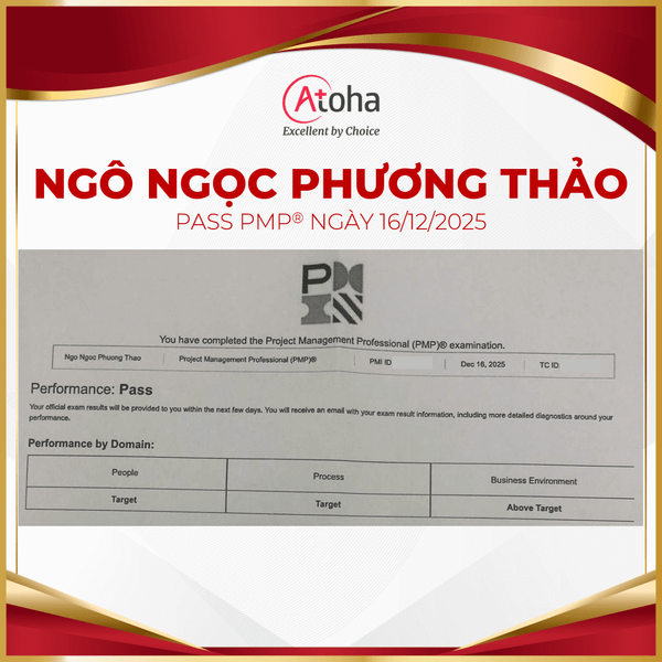 Một lần nữa chúc mừng chị Thảo. Atoha rất vui và tự hào khi có cơ hội đồng hành cùng chị trên hành trình PMP® vừa qua. Atoha tin rằng, với chứng chỉ PMP® trong tay, chị Thảo sẽ bước sang năm 2026 với một “bệ phóng” rõ ràng hơn, sẵn sàng đảm nhận những vai trò lớn hơn, dự án có độ phức tạp cao hơn và mở rộng thêm cơ hội phát triển trong môi trường chuyên nghiệp.