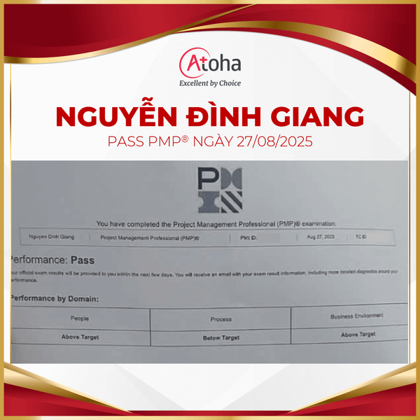 Chứng chỉ PMP® không chỉ là một chứng chỉ, mà còn là lời khẳng định mạnh mẽ về năng lực, bản lĩnh và tư duy của một nhà quản lý dự án chuyên nghiệp. Giờ đây, với "tấm vé vàng" này, anh Giang đã sẵn sàng tiến xa hơn, tự tin dẫn dắt những dự án lớn với tầm ảnh hưởng rộng. Atoha tự hào khi được đồng hành cùng anh trên con đường này. Chúc mừng anh đã hoàn thành xuất sắc mục tiêu PMP®, tạo bệ phóng vững chắc cho những thành công rực rỡ hơn trong tương lai.