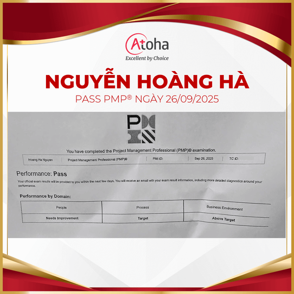 Atoha tự hào đồng hành cùng chị Nguyễn Hoàng Hà chinh phục thành công chứng chỉ PMP® ngay trong lần thi đầu tiên. Kết quả này là minh chứng cho năng lực vượt trội của chị trong lĩnh vực quản lý dự án, đồng thời cũng là lời khẳng định chắc chắn nhất cho chất lượng đào tạo tại Atoha.