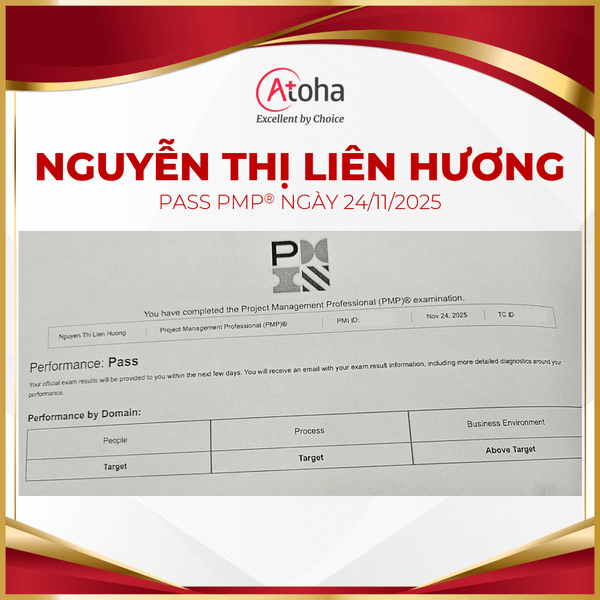 Ngày 24/11/2025, chị Nguyễn Thị Liên Hương đã xuất sắc vượt qua kỳ thi PMP® ngay trong lần thi đầu tiên. Thành tích này không chỉ ghi nhận nỗ lực của chị mà còn tiếp thêm động lực cho cộng đồng học viên Atoha trên hành trình chinh phục chuẩn quốc tế.