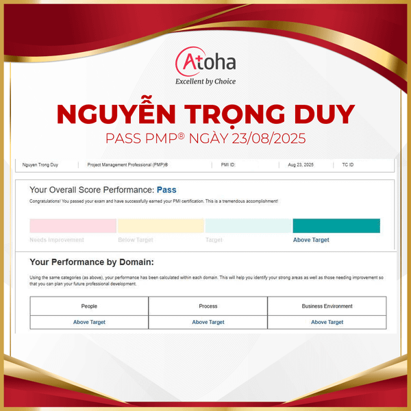 Chúc mừng anh Nguyễn Trọng Duy đã "vượt vũ môn PMP®" thành công! Với sự kiên trì và nỗ lực không ngừng, anh đã xuất sắc pass PMP max score on the first try vào ngày 24/08/2025.