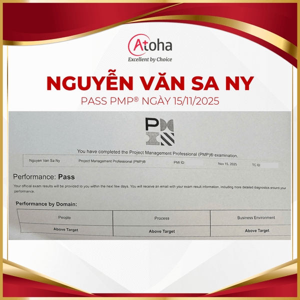 Một lần nữa, chúc mừng anh Nguyễn Văn Sa Ny, Atoha tự hào khi có cơ hội đồng hành cùng những học viên xuất sắc như anh trên hành trình thực hiện sứ mệnh "Nâng tầm nhân lực Việt chuẩn quốc tế". Chúc anh tiếp tục giữ vững tinh thần học tập không ngừng, áp dụng hiệu quả kiến thức từ PMP vào công việc và chinh phục thêm nhiều thành tựu mới trong tương lai.
