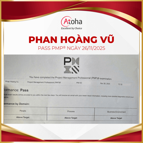 Atoha gửi lời chúc mừng chân thành đến anh Phan Hoàng Vũ, học viên đến từ khóa PMPPRO54, đã chính thức vượt qua kỳ thi PMP® vào ngày 26/11/2025 với một thành tích cực kỳ ấn tượng: đạt kết quả Above Target ở cả 03 domains.