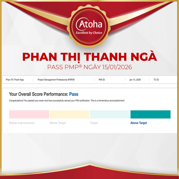 Chinh phục chứng chỉ PMP® chưa bao giờ là mục tiêu dễ dàng, bởi đó là hành trình đòi hỏi sự đầu tư nghiêm túc và tư duy hệ thống theo chuẩn quốc tế. Ngày 16/01/2026, Atoha hân hoan ghi nhận một cột mốc đáng tự hào khi chị Phan Thị Thanh Ngà đã chính thức vượt qua kỳ thi PMP®, khép lại chặng đường ôn luyện đầy nỗ lực và mở ra một bước tiến mới trong sự nghiệp.