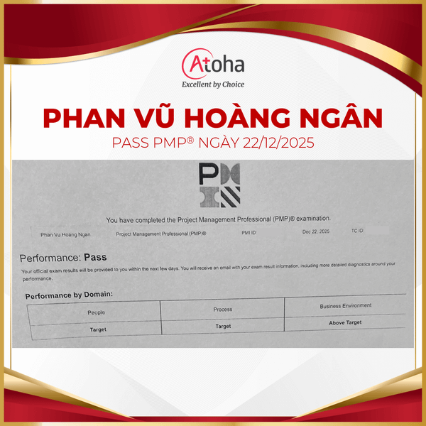 Hành trình chinh phục PMP® đầy nỗ lực của chị Phan Vũ Hoàng Ngân đã thành công khép lại khi chị chính thức pass PMP® on the first try vào ngày 22/12/2025. Atoha tin rằng, chứng chỉ PMP® sẽ là khởi đầu cho những thành công rực rỡ hơn nữa của chị trên con đường sự nghiệp phía trước.