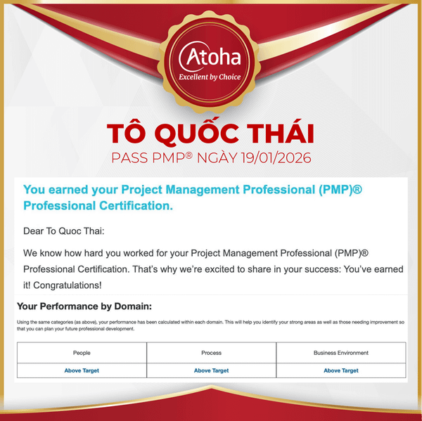 Đây không chỉ là một cột mốc đáng tự hào trong hành trình học tập, mà còn là minh chứng rõ nét cho nền tảng kiến thức vững chắc, tư duy quản lý dự án bài bản và sự kỷ luật bền bỉ của anh Thái trong suốt quá trình ôn luyện. PMP® vốn được xem là một trong những chứng chỉ khắt khe nhất trong lĩnh vực quản lý dự án, và việc đạt Above Target ở cả 03 domains là thành tích vô cùng ấn tượng và đáng tự hào.