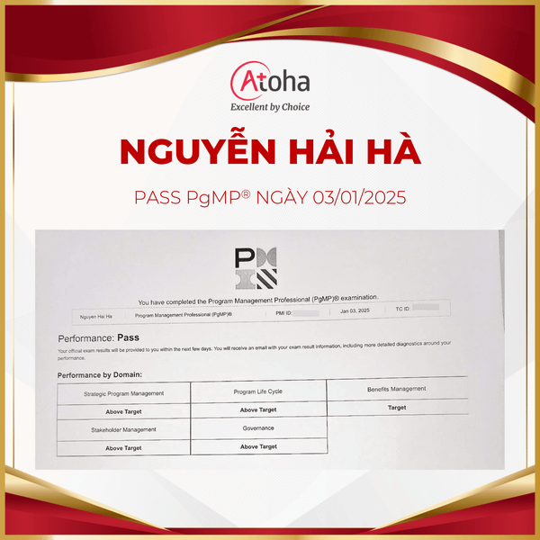 Chứng chỉ PgMP®là một cột mốc, nhưng hơn thế nữa, đó là bước đệm để anh Hà tiếp tục lan tỏa năng lượng học tập, chia sẻ kinh nghiệm, và truyền cảm hứng cho cộng đồng học viên Atoha – những người đang trên hành trình vươn tới chuẩn mực quản lý toàn cầu.