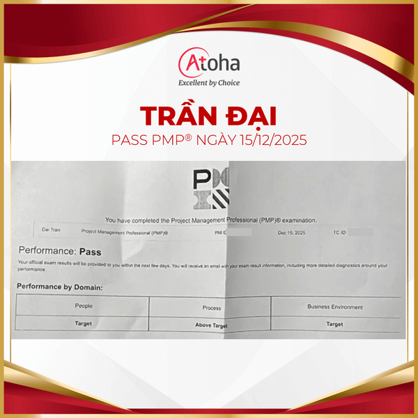 Giữa tháng 12, Atoha tiếp tục ghi nhận thêm những kết quả tích cực từ các học viên. Trong chuỗi thành tích ấy, Atoha hân hoan chia sẻ niềm vui cùng anh Trần Đại (học viên khóa PMPONLINEPRO46) khi anh xuất sắc vượt qua kỳ thi chứng chỉ PMP ngay trong lần thi đầu tiên vào ngày 15/12/2025.