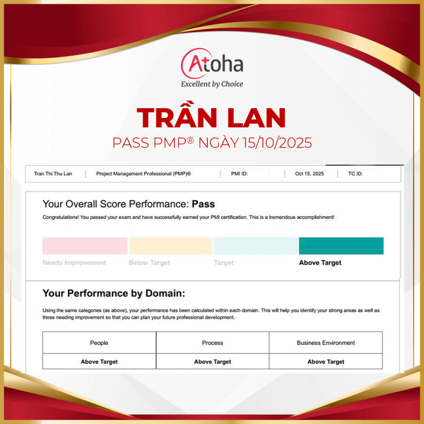 Atoha tự hào chúc mừng bạn Trần Lan, một thành viên của Atoha Team, đã xuất sắc vượt qua kỳ thi chứng chỉ Project Management Professional (PMP®) với điểm số tối đa (đạt Above Target ở cả 3 domain) vào ngày 15/10/2025.