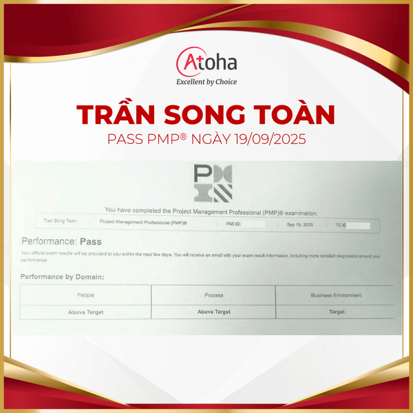 Atoha gửi lời chúc mừng đến anh Trần Song Toàn với thành tích ấn tượng - pass PMP® near max socre on the first try. Hy vọng rằng anh có thể tận dụng tối đa những giá trị từ PMP® mang lại để gặt háo được nhiều thành công hơn nữa trên hành trình phát triển sự nghiệp của mình.