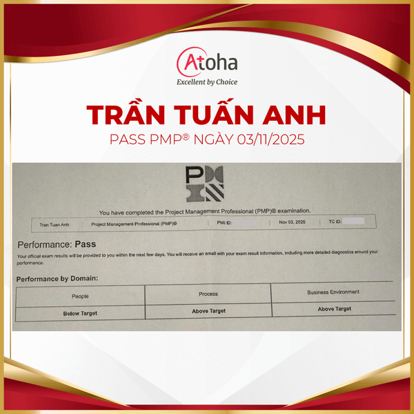 Ngày 03/11/2025, anh Trần Tuấn Anh đã chinh thức vượt qua kỳ thi PMP®, hoàn thành một trong những mục tiêu quan trọng trong năm. Atoha hân hoan chúc mừng anh với thành tích đáng tự hào này và tin tưởng rằng chứng chỉ PMP® sẽ là bệ phóng giúp anh tiến xa hơn nữa trên con đường sự nghiệp của mình.