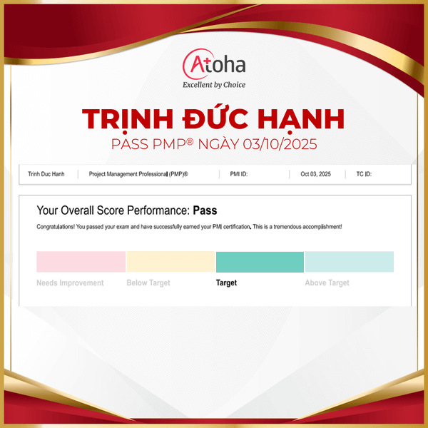 Chúc anh Hạnh tiếp tục giữ vững tinh thần ấy trong công việc, biến kiến thức PMP thành năng lực thực tiễn giúp đội nhóm và dự án phát triển bền vững. Atoha luôn sẵn sàng đồng hành cùng anh trên những chặng đường mới.
