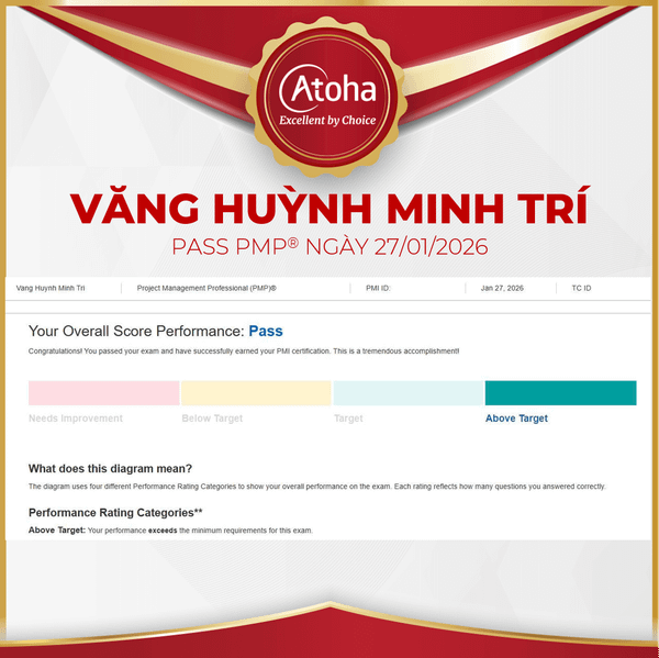 Hành trình chinh phục PMP® luôn đòi hỏi sự bản lĩnh, kỷ luật và quyết tâm bền bỉ đến cùng. Ngày 27/01/2026 đã trở thành một cột mốc đáng nhớ khi anh Văng Huỳnh Minh Trí, học viên PMPONLINEPRO50, chính thức pass PMP®, ghi dấu thành quả cho quá trình nỗ lực nghiêm túc và định hướng rõ ràng mà anh đã theo đuổi.