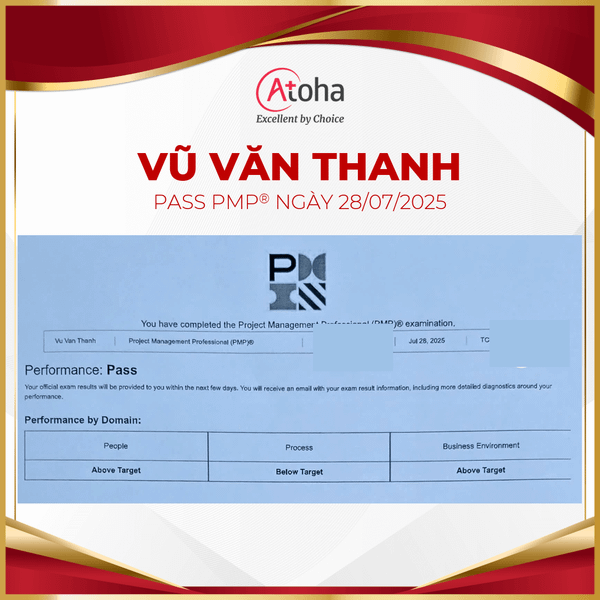 Hành trình PMP® của anh Vũ Văn Thanh đã chính thức khép lại với thành tích xuất sắc pass PMP® on the first try vào ngày 28/07/2025. Hy vọng trong thời gian tới, Atoha sẽ tiếp tục có cơ hội đồng hành và hỗ trợ anh chinh phục những cột mốc cao hơn, giá trị hơn.
