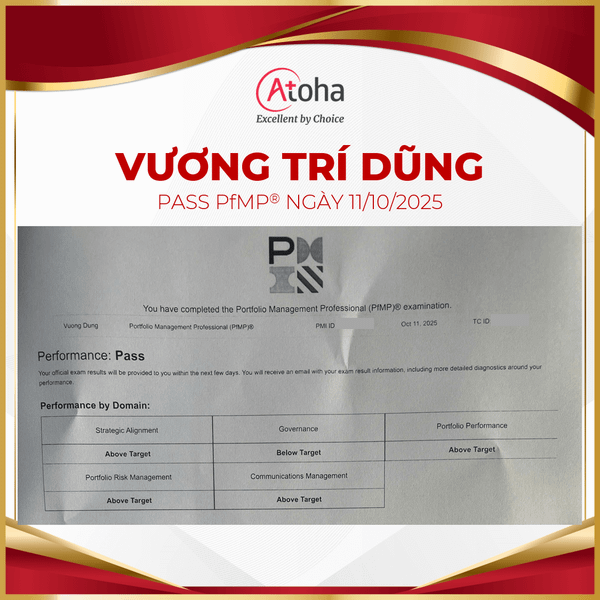 Atoha tự hào đồng hành cùng anh Vương Trí Dũng xuất sắc vượt qua kỳ thi chứng chỉ PfMP và hoàn thành bộ sưu tập 3P (PMP, PgMP, PfMP) của mình với các kết quả cực kỳ ấn tượng. Thành công này chính là lời khẳng định chắc chắn nhất cho năng lực vượt trội, cùng tinh thần học hỏi không ngừng của anh Dũng.